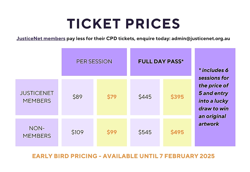 All Webinar ticket buyers will receive an email well in advance with details on how to attend each session. Please contact admin@justicenet.org.au if you have any questions or concerns.